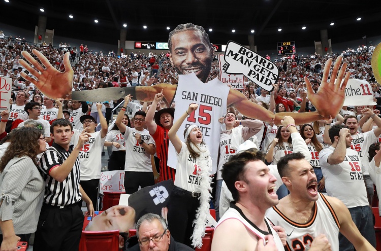 值得一提的是,圣迭戈州大正是现效力于快船的球星,莱昂纳德的母校。莱昂纳德在圣迭戈州大效力了两年,大一场均12.7分9.9篮板,帮助校队取得了25-9的战绩,并获得了出战全美锦标赛(疯三)的资格,但在首轮以59-62惜败田纳西大学(莱昂纳德12分10篮板)。大二他场均15.7分10.4篮板,圣迭戈州大取得了34胜3负的战绩,并在全美锦标赛中晋级甜蜜16强(输给了最终的冠军康涅狄格大学),莱昂纳德入选了全美第二阵容。2020年,圣迭戈州大退役了莱昂纳德的15号球衣。