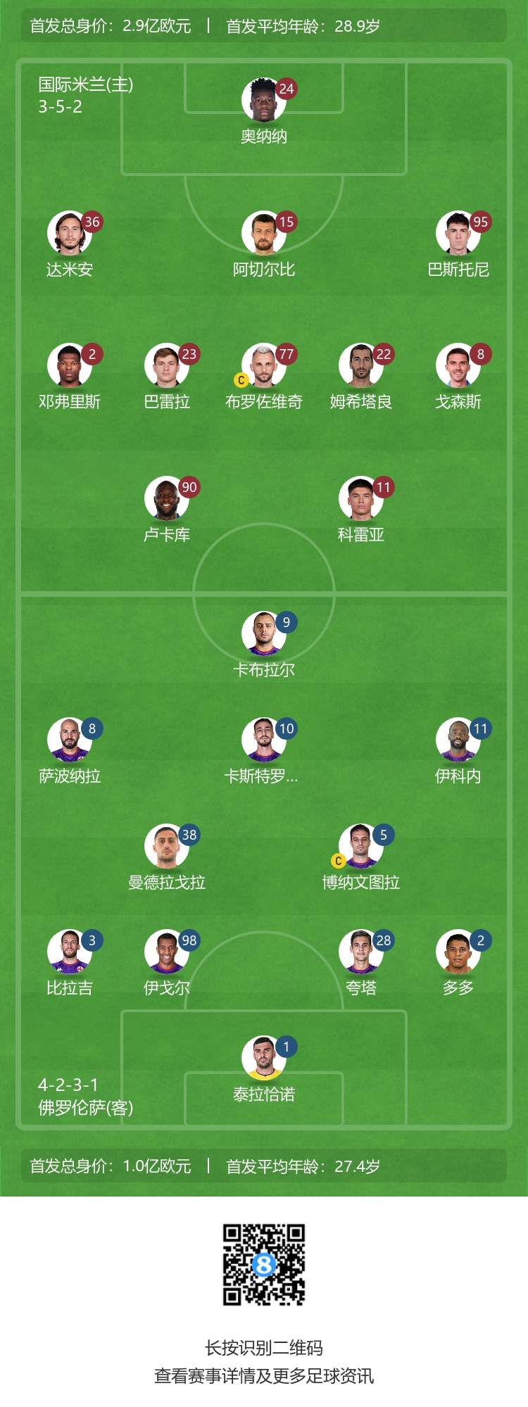 佛罗伦萨首发:1-泰拉恰诺、2-多多、3-比拉吉、28-夸尔塔、98-伊戈尔、5-博纳文图拉、8-萨波纳拉、10-卡斯特罗维利、11-乔纳森-伊科内、38-曼德拉戈拉、9-A-卡布拉尔
