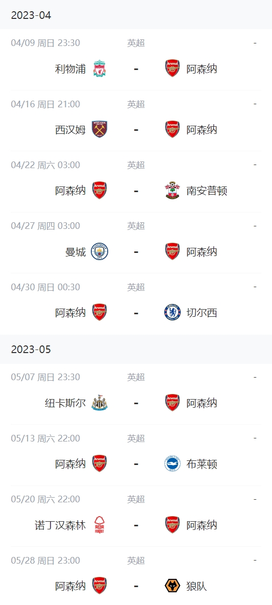 目前在英超积分榜上,阿森纳先赛一场,领先身后的曼城8分,本赛季枪手联赛赛程仅剩9场。