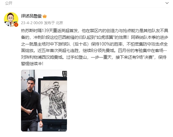 詹俊:“热苏斯时隔139天重返英超首发,他在禁区内的创造力与抢点能力是其他队友不具备的,冲刺阶段这位巴西前锋的归队起到“如虎添翼”的效果!