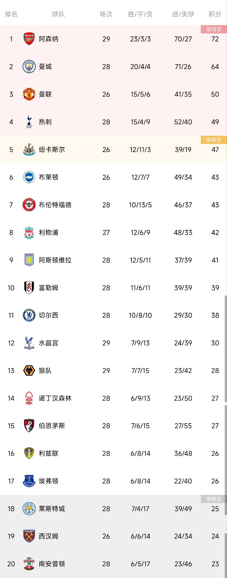 积分榜方面阿森纳多赛一场8分领跑,曼城第二,切尔西两轮不胜,跌至第11。